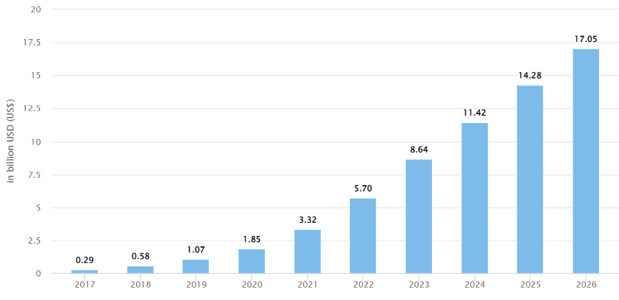 In Switzerland, robo-advisory has seen consistent growth since 2017. Statista estimates current Assets under management71 (AUM) at USD 5.7 billion, and projected to hike to USD 17.5 billion by 2026. In addition, AUM are expected to show an annual growth rate between 2022 and 2026 of 31.13% resulting in a projected total amount of USD 17.32 billion by 202672.